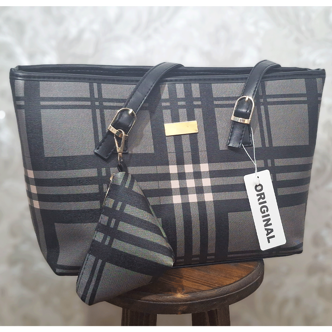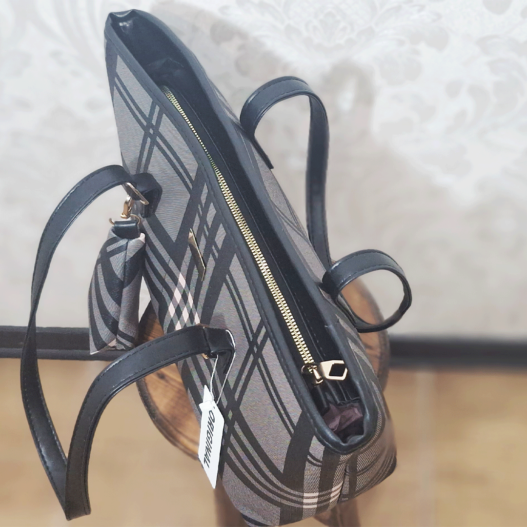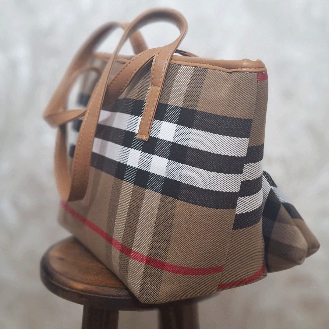طرح چهارخانه روی کیف بسیار شبیه به طرح معروف برند بربری (Burberry Check) که شامل خطوط مشکی، سفید و خاکستری روی پسزمینه خردلی/عسلی یا بژ است.