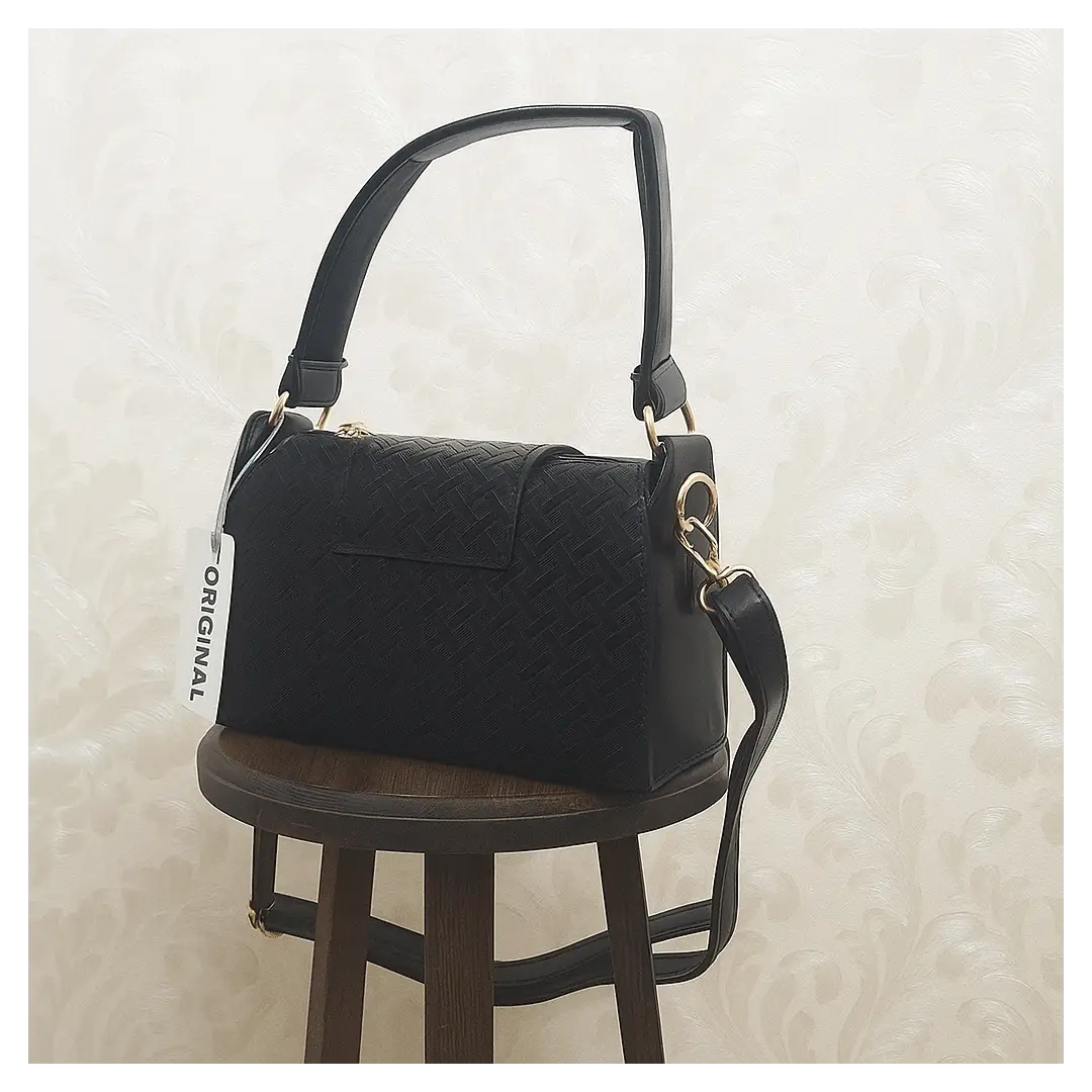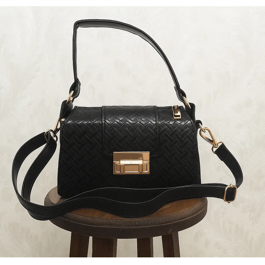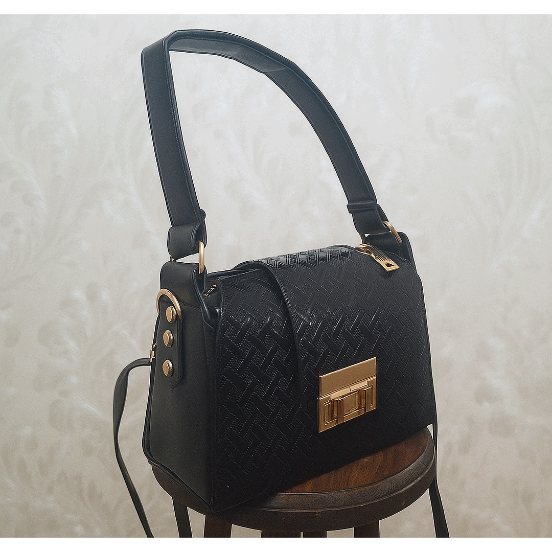 • درخشش شبانه روزی: کیف دوشی مشکی بافت‌دار و قفل طلایی – تعریف جدیدی از ظرافت.